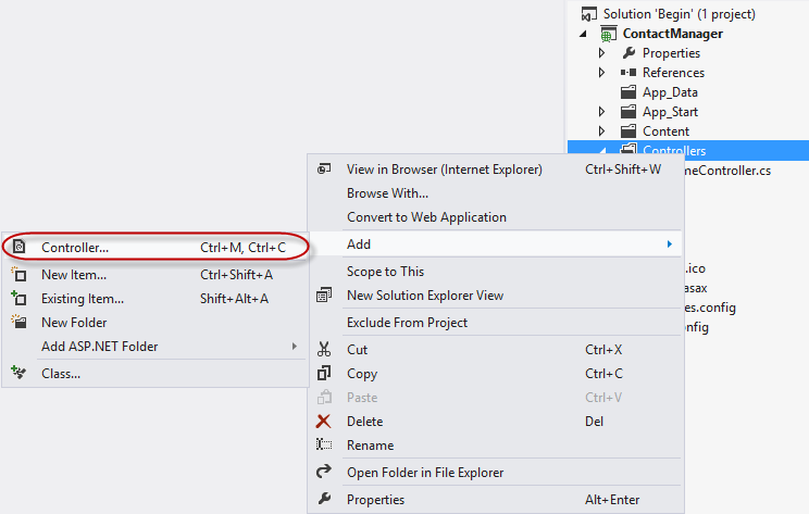 از منوی File گزینه New Project را انتخاب کنید. از بخش Visual C# و Web نوع پروژه را مشخص کنید. از بخش سمت راست گزینه ASP.NET MVC 4 Web Application را انتخاب کنید. نام پروژه را ContactManager وSolution name  را Begin قرار دهید و سپس Ok کنید.