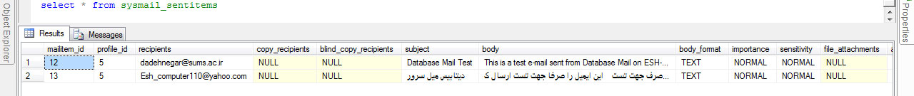 وضعیت ایمیل های ارسال شده در تیبل sysmail_mailitems نمایش داده می شود هنگامی که ایمیلی با موفقیت ارسال شود وضعیت فیلد sent_status در تیبل sysmail_mailitems برابر با یک می شود. وضعیت ایمیل های ارسال نشده یا همان failed شده ها در فیلد sent_status مقدارشان برابر 2 است و آنهایی هم که تنظیم نشده اند وضعیتشان برابر 3 قرار می گیرد