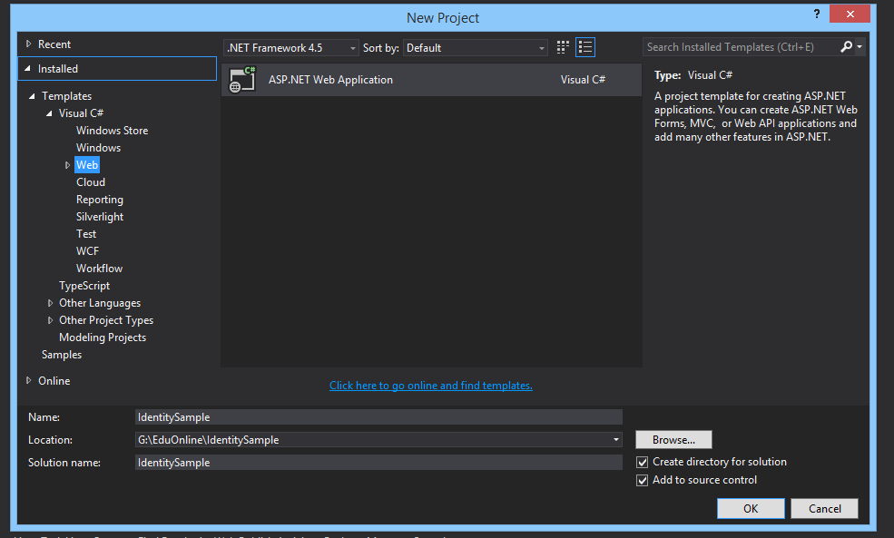 برای شروع کار Visual Studio را باز کنید سپس New-> project را انتخاب کنید و در پنجره باز شده مانند زیر NET framework 4.5 را انتخاب کنید و سپس بر روی گزینه ASP.NET Web Application کلیک کنید.