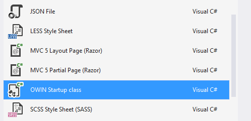برای ثبت کردن UptimeHub در Visual Studio 2013 ما می توانیم یک “OWIN Startup class” را مانند تصویر زیر به پروژه خود اضافه کنیم.