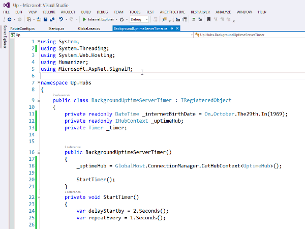 برای جدا کردن این خطوط از یکدیگر در صفحه HTML در یک تگ DIV با نام “message” نمایش می دهد. برای قرار گرفتن اطلاعات در مرکز صفحه از لحاظ ارتفاع می توانید این مقاله را مطالعه کنید.     ثبت کردن SignalR Hub برای ثبت کردن UptimeHub در Visual Studio 2013 ما می توانیم یک “OWIN Startup class” را مانند تصویر زیر به پروژه خود اضافه کنیم.   در انتهای این کلاس ما SignalR hub خود را ثبت می کنیم.   using Microsoft.Owin; using Owin;   [assembly: OwinStartup(typeof(Up.Hubs.Startup))]   namespace Up.Hubs {     public class Startup     {         public void Configuration(IAppBuilder app)         {             app.MapSignalR();         }     } }   ساخت یک Humanizer Timespan کتابخانه Humanizer به شما اجازه می دهد یک برنامه را بر اساس human-feeling (احساس انسانی) ایجاد کنید. در کد تایمر نهایی که ما می خواهیم در یک لحظه چیزی را که ما استفاده کنیم در چندین روش مشاهده کنیم. در ابتدا باید نحوه استفاده از TimeSpan را بدانیم. برای ساخت TimeSpan به صورت2 second ، کافی است فقط کد زیر را بنویسیم   2.Seconds()   Second برای فراخوانی متد Humanize در یک TimeSpan برای دریافت یک رشته شبیه “2 weeks, 3 days, 4 hours” است. هنگامی که ما این متد را فراخوانی می کنیم، ما می توانیم واحد زمانی خود را مشخص کنیم، به صورت پیش فرض ما فقط بزرگترین را دریافت می کنیم، مثل: “2 weeks” ما همچنین می توانیم یک DateTime کامل با نوشتن کد زیر ایجاد می کنیم.   On.October.The29th.In(1969);   پیاده سازی کلاس IRegisteredObject BackgroundUptimeServerTimer کد کامل کلاس به صورت زیر است. در سازنده کلاس ما یک reference به UptimeHub و Start کردن background timer دریافت می کنیم. در هر ثانیه متد BroadcastUptimeToClients فراخوانی می شود تا یک humanized string ایجاد کند و آن را به تمامی کلاینت ها ارسال کند.   public class BackgroundUptimeServerTimer : IRegisteredObject {     private readonly DateTime _internetBirthDate = On.October.The29th.In(1969);     private readonly IHubContext _uptimeHub;     private Timer _timer;         public BackgroundUptimeServerTimer()     {         _uptimeHub = GlobalHost.ConnectionManager.GetHubContext();           StartTimer();     }     private void StartTimer()     {         var delayStartby = 2.Seconds();         var repeatEvery = 1.Seconds();           _timer = new Timer(BroadcastUptimeToClients, null, delayStartby, repeatEvery);     }     private void BroadcastUptimeToClients(object state)     {         TimeSpan uptime = DateTime.Now - _internetBirthDate;           _uptimeHub.Clients.All.internetUpTime(uptime.Humanize(5));     }           public void Stop(bool immediate)     {         _timer.Dispose();           HostingEnvironment.UnregisterObject(this);     } } من قبلا یک وب سایت در Azure ایجاد کرده ام، پس حالا به سادگی سایت خود را برای آن publish می کنم:   خروجی برنامه به صورت زیر است:   ", "image": "/landingpages/images/blog-image-one.jpg", "author": { "@type": "", "name": "اسماعیل شیدایی", "url": "" }, "publisher": { "@type": "Organization", "name": "شرکت توسعه و مدیریت پارسیان زرین | Ably ابلای", "logo": { "@type": "ImageObject", "url": "https://ably.ir/" } }, "datePublished": "1393/5/25 10:18:22", "dateModified": "" }